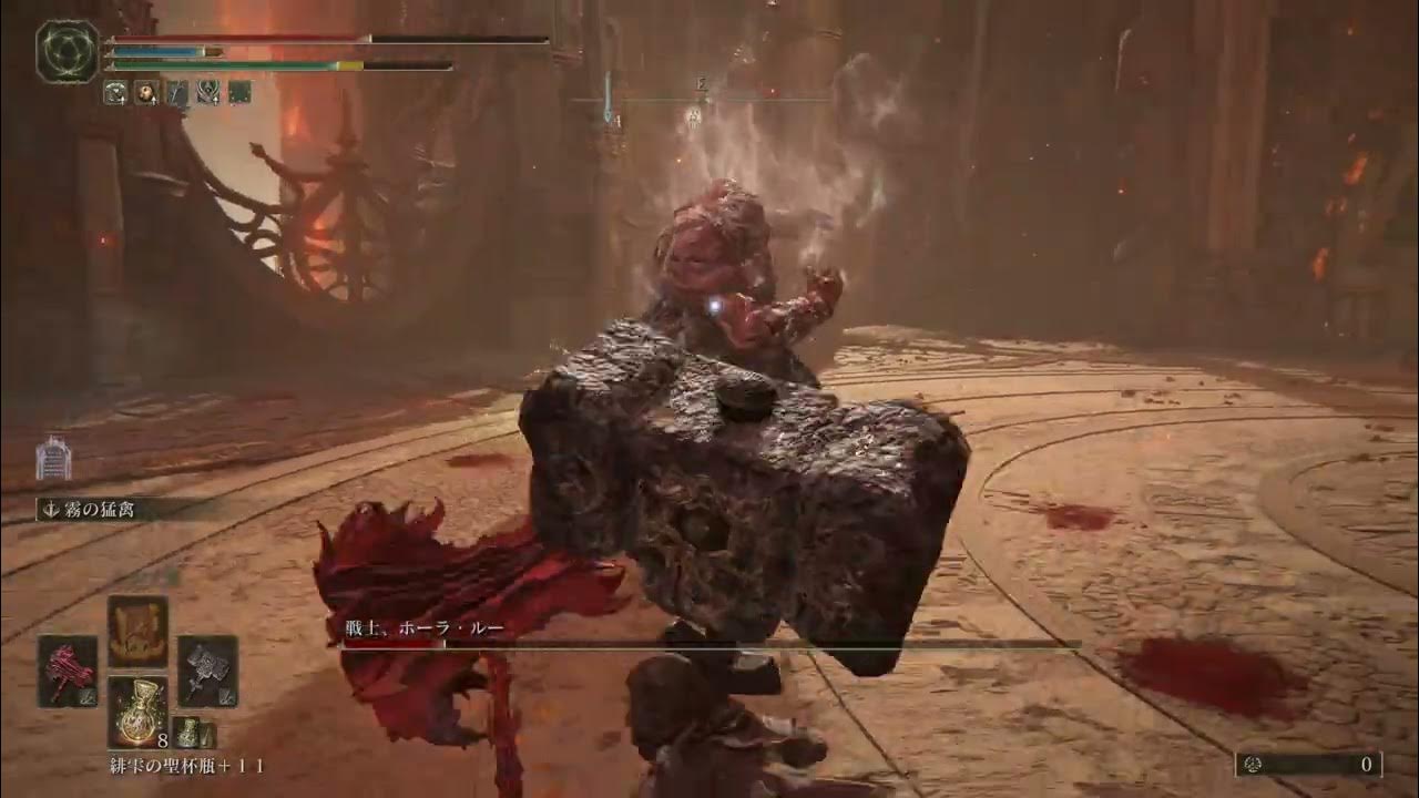今までは攻撃系戦技のみでやっていましたが、今回はそれを一切使わずに防御系戦技かつ特大武器2刀流(大槌)で倒しました。霧の猛禽が発動時無敵なのと発動後にその場の上空から自身が出現する為、ジャンプ攻撃を強化しています。2刀流ジャンブ攻撃は硬直が...